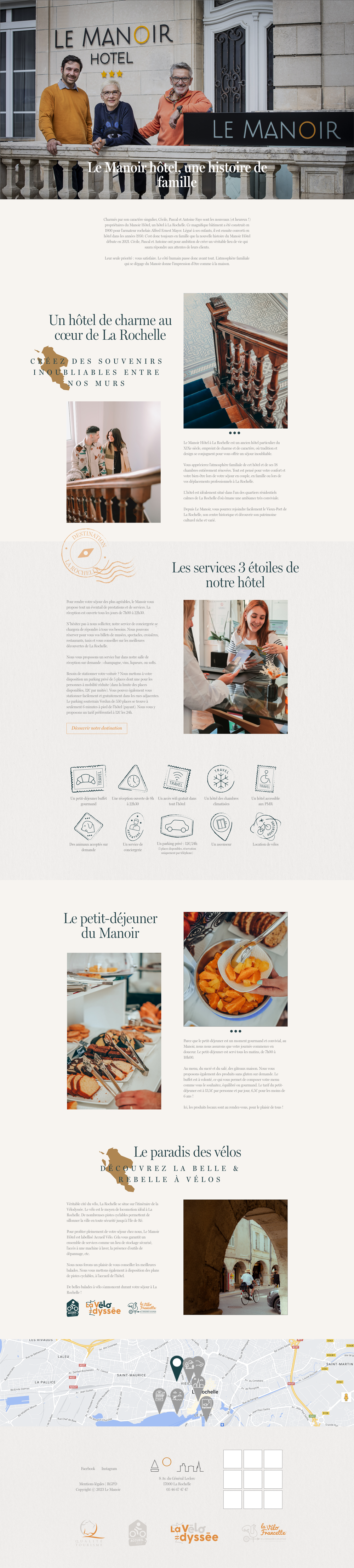 Le site reprend la charte graphique existante de l’hôtel et s’appuie sur un storytelling visuel inspiré d’une « carte postale digitale ». Les visuels pleine largeur, les animations discrètes et les clins d’œil au port de La Rochelle viennent renforcer l’ancrage territorial et l’atmosphère chaleureuse du lieu.